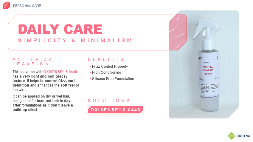 Oxiteno has suggestions for mild formulations that serve consumers needs in terms of well-being and sensory experiences. One is the Antifrizz Leave-on conditioner, but OXISENSE® S 0440 can also be used in a full line for curly and frizzy hair, such as 2-in-1 shampoos, leave-on treatments, masks, combing cream, and day-after formulas.