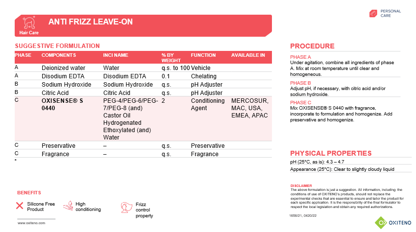 See the suggested Antifrizz Leave-on formulation with OXISENSE® S 0440.