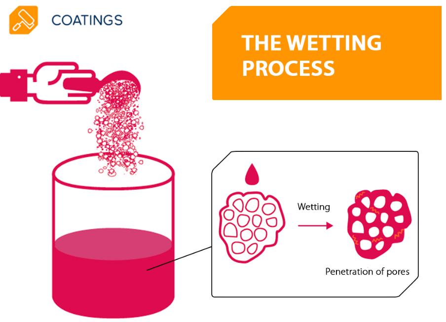 The pigment dispersion process can be divided into three stages: wetting, dispersion/grinding, and stabilization. In wetting, it is important to use an additive that can reduce the surface tension of the water, enabling it to penetrate pigment pores thereby wetting of the pigments to be dispersed.